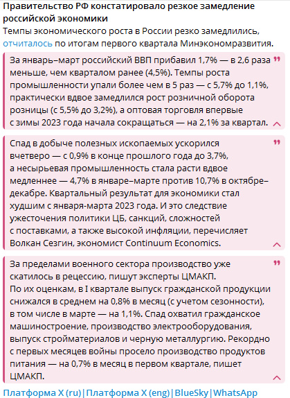 Цитата: Администратор от 02.05.2025, 22:27Учитывая, что оборонка работает вовсю, замедление общих темпов означает спад в гражданском секторе экономики.