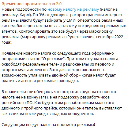 Цитата: Администратор от 18.11.2024, 14:14Чем хуже дела в государстве, тем больше оно пытается сдирать с народа. Налог с рекламы, рост штрафов ПДД, коммуналка - все идет в кассу...