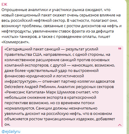 скажутся очередные санкции США на российском нефтяном экспорте:Накануне в черные списки американского Минфина попали "Газпромнефть", "Сургутнефтегаз", ряд "дочек" "Роснефти", несколько страховых компаний, танкеры "теневого флота", нефтетрейдеры и т.д. В моменте это привело к удорожанию нефти на мировых рынках (Brent ушла выше $80 за баррель) и отскоку российского фондового рынка, который сильно просел вожидании санкций.Что касается долгосрочных перспектив, то они с появлением новых санкций не изменились. Российская нефть стала еще чуть более токсичной, а прогнозируемые объемы экспорта будут снижаться в пользу других поставщиков, в первую очередь из США, а также Ирана (по которому готовится новая сделка), Сирии (с которой уже снимают часть санкций), Венесуэлы и др. Параллельно будут расти и скидки на нефть из РФ, что приведет к снижению как физических, так и денежных показателей экспорта.