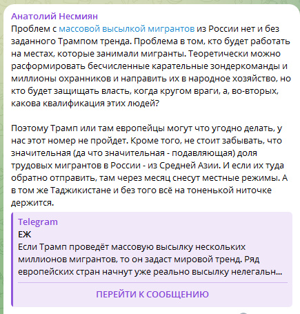 Цитата: Администратор от 19.01.2025, 00:33Везут мигрантов, спасая государственность российскую, тысячу лет державшуюся на почти дармовом труде. Поэтому никакая власть массово их депортировать не будет. Не самой же власти работать идти?