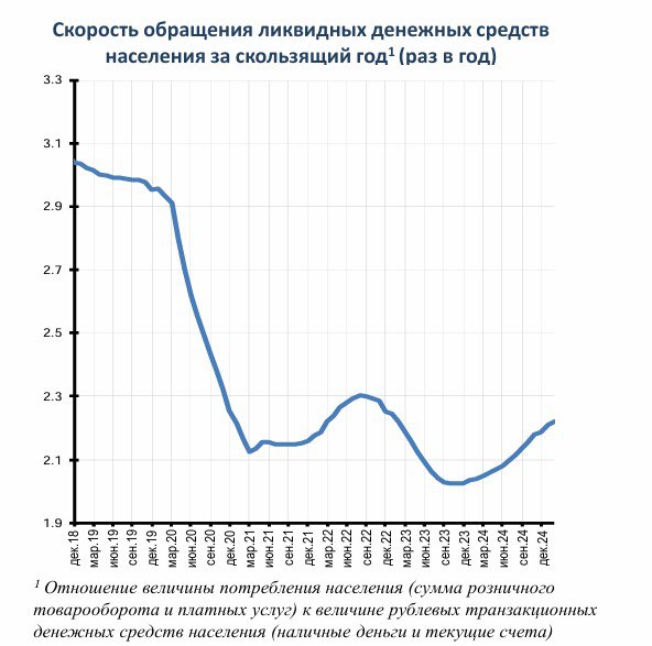 Скорость обращения ликвидных денежных средств населения с 2018 года сократилась на треть. Причём мы видим, что эта проблема началась ещё за три года до СВО, в 2020 году, в ковидный кризис, а далее только усугубилась.«Сохраняющиеся сверхвысокие ставки в экономике продолжают оказывать сильное понижательное давление на ликвидную часть широкой денежной массы (доля ликвидной части, по состоянию на февраль, уже опустилась до минимальных уровней, начиная со второй половины 2020 г.). Такое перераспределение между ликвидной и сберегательной частью денежной массы означает, что в краткосрочном аспекте инфляционное давление уменьшается, зато формируется среднесрочный «инфляционный навес», способный разбалансировать потребительский рынок при переходе Банка России к снижению ставок».