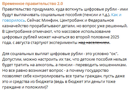 То, что цифровые фантики будут впаривать тем, кому деваться некуда, было понятно сразу. Вопрос, кто их принимать будет? Если получится так, что это деньги для нищих, то связываться с ними мало кто захочет.