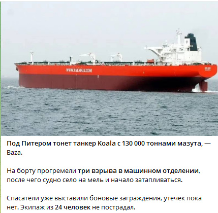 Если не случайность, то подрыв танкера очень печальный сигнал для Москвы. Церемонии кончились, начались удары по больному. Сколько протянет Рф без валюты, вопрос другой. СССР продержался два года с минусовым балансом. А по нынешним временам и два месяца Москве за счастье.