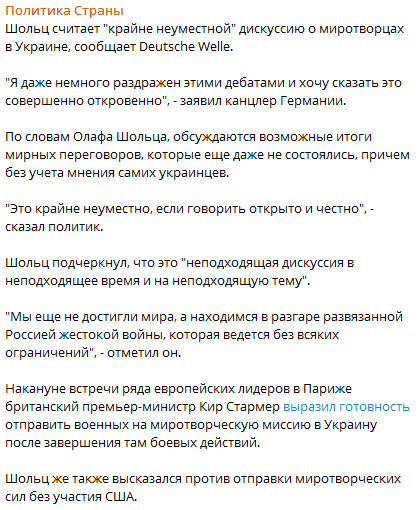 Шольц упирается, потому что понимает, фактически евровойскам придется воевать на стороне Ук, причем всерьез. Чтобы там не наподписывали, опыт срыва любых и всяческих договоренностей за 8 лет накоплен колоссальный. А сидеть молча под обстрелами сейчас уже вряд ли будут.