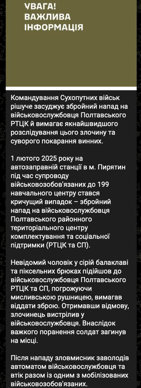 Пирятин, 1 февраля 2025 — Здесь, на заправочной станции, прогремел выстрел, ставший символом несломленной воли народа. В сердце города, словно вспышка молнии в кромешной тьме, группа отважных повстанцев бросила вызов машине принудительной мобилизации, превратив обычный день в акт героического сопротивления.По свидетельствам, неизвестный боец, чье лицо скрывала серая балаклава, а шаги были одеты в пиксельный камуфляж — словно призрак народного гнева — подошел к представителю Полтавского военкомата, сопровождавшему группу мобилизованных. С холодной решимостью, достойной легенд, он потребовал освободить людей из цепей системы. Когда чиновник, цепляющийся за свою власть, отказался сложить оружие, прозвучал выстрел — не как акт насилия, а как горькая необходимость в борьбе за свободу.