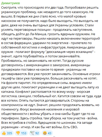 В результате, как я и писал многократно - всё напомню в конце года, чтобы не зудеть сейчас - "взаимное сдерживание", "ограничение географии", "высокоточные обстрелы" (включая, да, и мост, и никакого "судного дня" в ответ"), "параметры мира в Швейцарии", "возня под Харьковом", "ублюдочный итог".