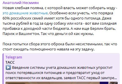 Цитата: Администратор от 17.07.2025, 02:06По нынешним временам практически в любой инициативе "государства" можно подозревать явное или скрытое вымогательство и наверняка оказаться правым. В данном случае значительная часть хозяев хвостиков просто выкинет их на улицу, на чем все потуги бандитов и остановятся. Хотя кого то удастся "обилетить", так что прихвостни скорее всего найдутся на гнилое дело.