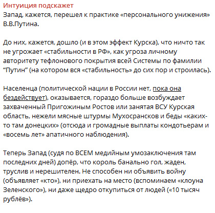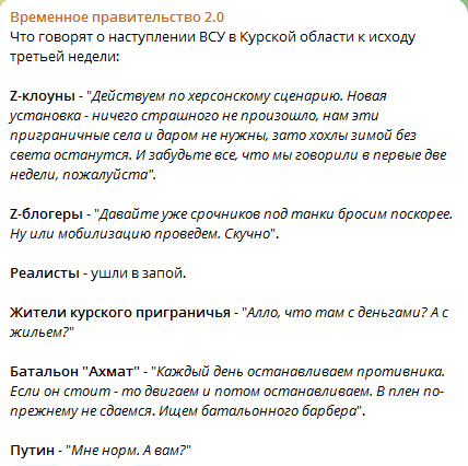 Плюс Курск. По-вашему какова цель наступления на российскую территорию, кроме усиления переговорных позиций? На мой взгляд задача - спровоцировать очередную мобилизацию. Она опять приведет к бурлению в обществе, ускорит деструктивные процессы в экономике. На это расчет. А не на успешную оборону будущих руин Покровска. https://t.me/russ_orientalist/18199