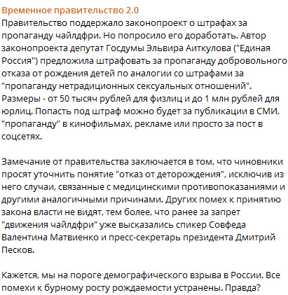 И как, интересно, собираются "бороться с идеологией чайлдфри"? ЦК партии чайлдфри арестуют?