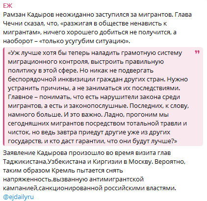 Заступничество Кадырова за мигрантов вполне объяснимо. После мигрантов волна хейта пойдет на представителей северокавказского региона, втч и Чечни. Взаимоотношения с ними и так не очень, а подзуживаемые властью вполне способны "выпилить" их из центральной России.