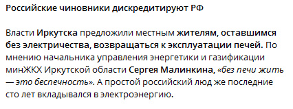 Цитата: Администратор от 20.10.2024, 18:46Чиновник совершенно прав, собственная печка куда надежней коммуналки. Только вслед за отсутствием коммуналки встанет следующий вопрос, а зачем тогда нам власть? Если не может обеспечить минимальные удобства, зачем платить этой своре дармоедов налоги, жить по их указкам? Это вопрос только времени и запугивание тут не поможет.