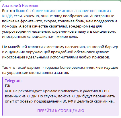 Если не удастся затея с переброской хотя бы 50-тысячной группировки войск КНДР на фронт, то РФ попадет в переплет. Потому как наступило "равновесие изнурения" и даже не самая большая гиря, брошенная на одну из двух чаш весов, может радикально изменить ситуацию. Война - вообще цепь кризисов.