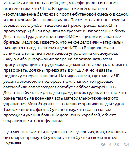 Одно из самых засекреченных ЧП в России. Украина, конечно, охотно признала авторство диверсии, но где Владивосток, а где Украина... Выбрать из двух зол, либо признать диверсию западной, как следствие, с предсказумым итогом противостояния с ним, либо признать Украину всемогущим монстром, взрывающим военные объекты за многие тысячи километров, так и не смогли, поэтому решили просто секретить по максимуму...