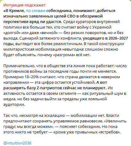 - возврат Чечни под федеральный контроль.Россия входит в фазу мягкой монархии с управляемой передачей власти дочери президента. Всё уже расставлено: активы, люди, охрана, образы. Остался только сигнал».