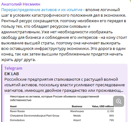 Все так. А затем начнется распад, когда сепаратизм станет методом защиты от "недружественного поглощения". Т е на силу власти потенциальные жертвы начнут отвечать своей силой. В случае Донбасса это сильно упростилось региональными особенностями, почти все бывшие были донецкими и смогли запустить сепаратизм немедленно, в России посложнее, но необходимость борьбы с властью для крупных собственников уже вызревает...