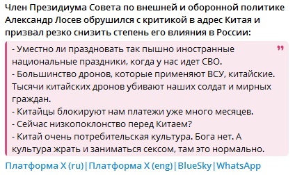 Цитата: Администратор от 16.02.2025, 00:43Кажется,в России кто то слишком серьезно воспринял заигрывания Трампа и решил, забегая вперед паровоза, разосраться с Китаем. Абсолютно уверен, в Пекине ведут ведомость подобных высказываний и ничего не забудут. Плевать в Китай можно, но если он плюнет в ответ?
