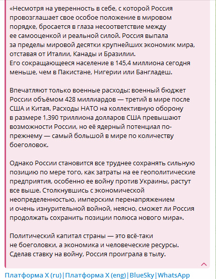 А вот эту идею Несмияна о перспективе войны России с Европой считаю довольно бредовой. Просто по причине отсутствия у Рф ресурсов на эту войну. Все, что есть боеспособного и большая часть всего остального, застряло на Украине. Где конца и краю войне не видно.