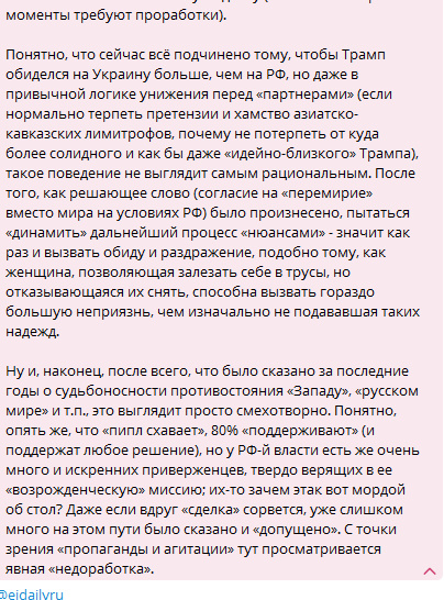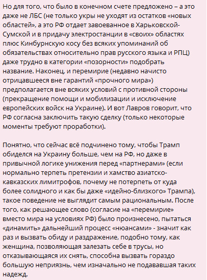 Цитата: Администратор от 27.04.2025, 20:02Ну если Кремль жаба задушила попросту купить Украину в 14-м, зато в 22-м приспичило повыеживаться перед Западом, то кто им виноват? А пипл да, схавает...