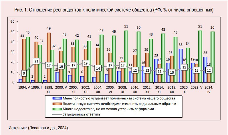 Но это не так. Элиты вынуждены реагировать на «закипающий котёл» народного отношения к Системе. Так было в конце Перестройки, когда дефицит ВСЕГО сдвинул народ отказать в поддержке начальству (ни в августе-91, ни зимой 1991/92 никто не вышел в поддержку советской власти).И так было в 1998 году – как мы видим на диаграмме. Тогда единственный раз за 35 лет наблюдений доля тех, кто ответил «Политическую систему необходимо изменить радикальным образом» (49%) превысила долю остальных ответов («Меня полностью устраивает политическая система нашего общества» - 2%, «Много недостатков, но их можно устранить реформами» - 32%).