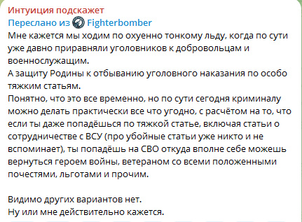 Цитата: Администратор от 23.10.2024, 14:04«На СВО-контракты стали приходить вчерашние школьники. Вот буквально вчерашние одиннадцатиклассники. А чего, работать идти не нужно, деньги большие для них. Еще очень много парней из глубинки, для них тоже боевые - огромные деньги. Но проблема в том, что они ведь нулевые совершенно, боевая подготовка нулевая, их готовить нужно для контракта. И все старшие нам говорят, чтобы мы не расслаблялись, всё это надолго, и контракты по сути бессрочные, до окончания боевых», рассказал вчера вечером мне в разговоре один мой знакомый военный, занимающийся призывом.