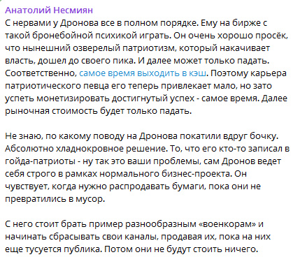 Интереснее другое, сейчас Дронов "выходит в кеш", а завтра начнут непосредственно участники правящего бандформирования "государство" бежать. Достаточно нескольких инцидентов с летальным исходом и начнется лавинная реакция бегства властей. И наступит самое время "вспомнить им все"...