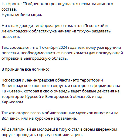 А какое веселье начнется со временем, когда десятки и сотни тысяч дезертиров, объединившись в банды, начнут гонять МВД и прочие власти в городах и селах, трудно даже представить. Москва, конечно, понимает все это. Потому велика вероятность решения снова запустить могилизацию в Донбассе. Они там криптохохлы, сами во всем виноваты, "большую" Россию сильно это не взволнует.