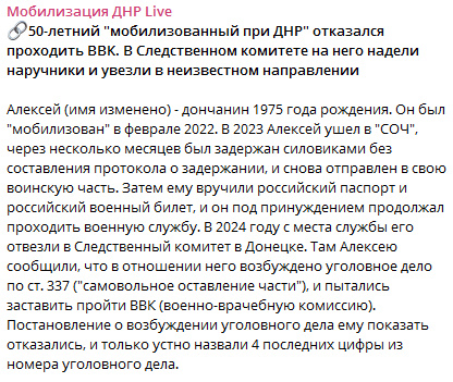 ✍️Это еще один засвидетельствованный случай вербовки людей с инвалидностью в Макеевке. В первом случае похищенного отпустили (https://t.me/mobdnrlive/9788) до того, как военные заставили его подписать какие-либо бумаги — по мнению его жены, освобождение состоялось благодаря жалобам и огласке.