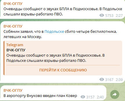 Цитата: Администратор от 05.05.2025, 02:55Очередной налет укрдронов на Подмосковье. Возможно, разведка боем в попытке выяснить диспозицию средств ПВО.