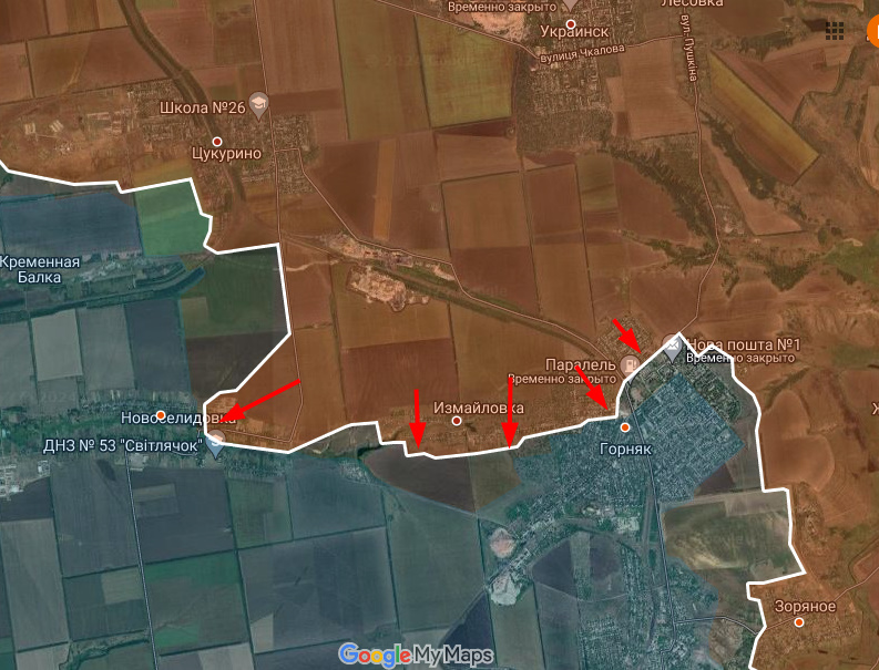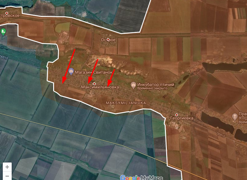 ВС РФ смогли захватить практически всю Максимильяновку и поля южнее. Параллельно идет наступление вдоль реки от Константиновки.