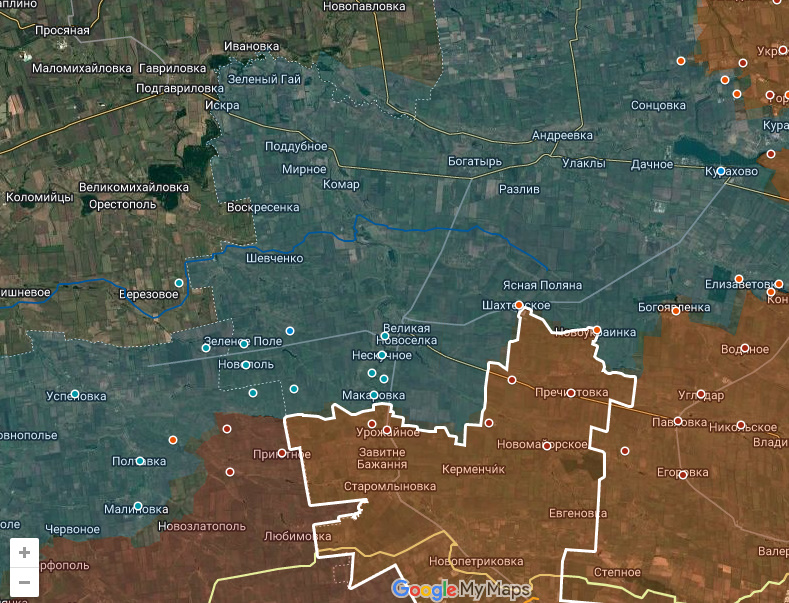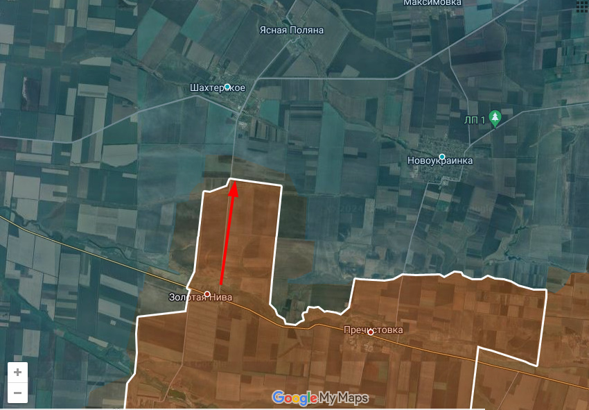 Цитата: Администратор от 26.10.2024, 04:31Еще один участок прорыва, от Золотой Нивы на север. На карте отмечено подтвержденное продвижение, однако украинские источники пишут, что Днр/Рф дошли до окраин Шахтерского.