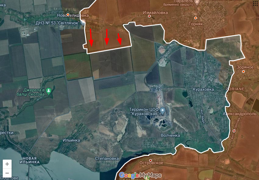 Тем самым создается угроза прорыва уже не к Курахово, а гораздо западнее, к Богатырю, с перспективой охвата Великоновоселки с севера.