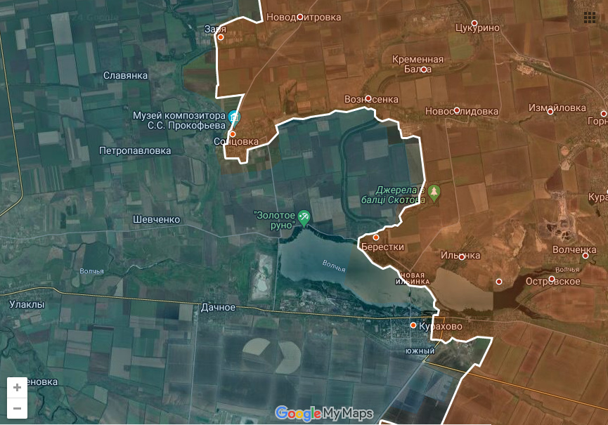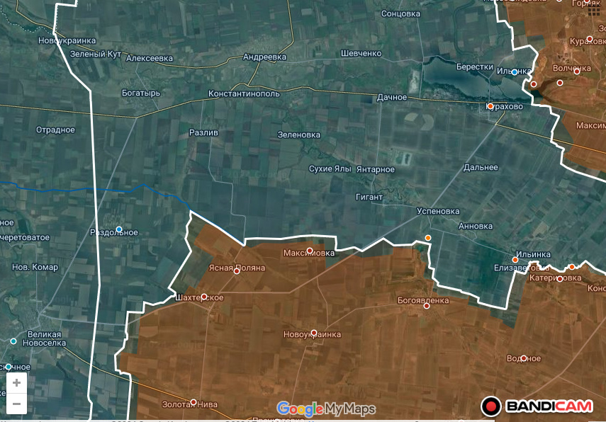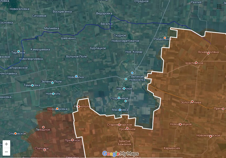 Самое интересное происходит в районе Великоновоселки. Там Днр/Рф подошли к райцентру широким фронтом с востока, одновременно продвинувшись с юго-запада. (Раздольное)