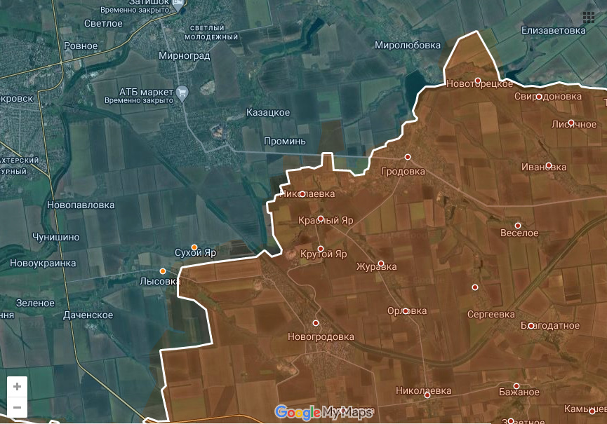 Цитата: Администратор от 08.11.2024, 16:25По сообщениям рос источников, Днр/Рф зашли в Зарю и Юрьевку. Вчера они писали о заходе в Сонцевку, независимых подтверждений этому пока нет.