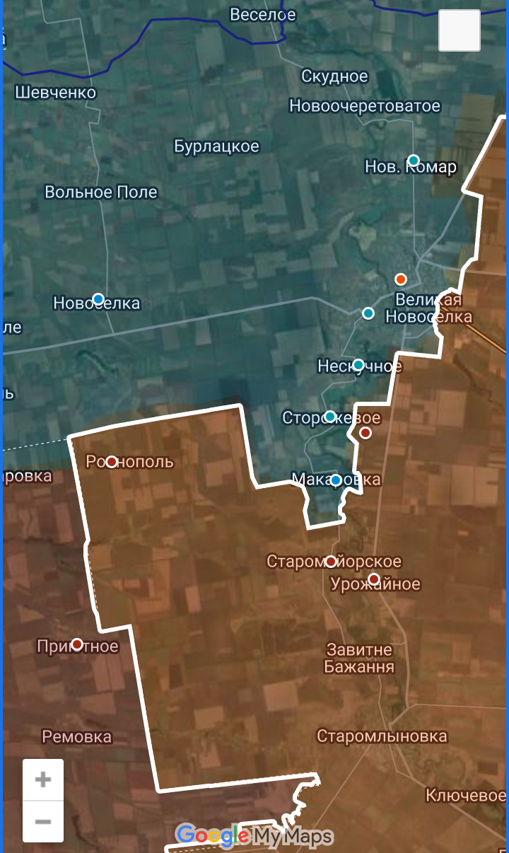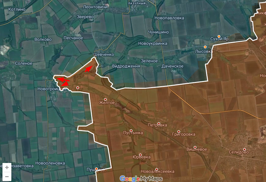 Цитата: Администратор от 10.12.2024, 21:04А между тем украинская оборона в районе Новотроицкого провалилась. Если на северо-восток от Шевченко (в сторону Красноармейска) продвижение незначительное, то на северо-запад, в направлении Волково и далее на перерезание трассы Красноармейск - Павлоград заметно больше.