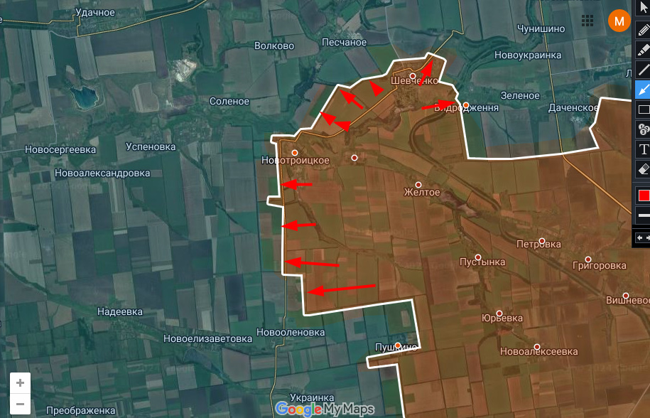 А между тем украинская оборона в районе Новотроицкого провалилась. Если на северо-восток от Шевченко (в сторону Красноармейска) продвижение незначительное, то на северо-запад, в направлении Волково и далее на перерезание трассы Красноармейск - Павлоград заметно больше.