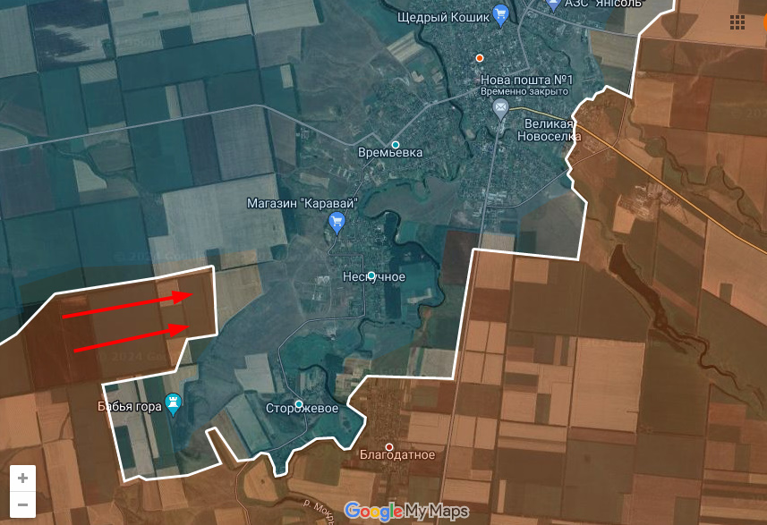 С Макаровкой (южнее Великоновоселовки) все вышло немного предсказуемо. "Клещи", а затем окружение примерно так и заканчиваются. Как минимум вчера она уже была занята Днр/Рф, а на данный момент на 3/4 окружено Сторожевое. Днр/Рф обошли поселок с северо-востока. Шансов удержать его у Всу практически нет.