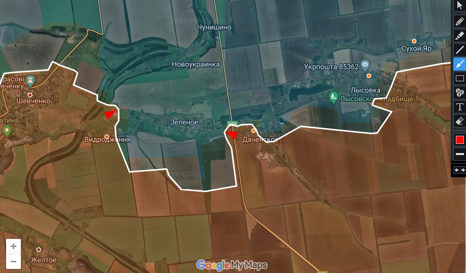 На южном участке Днр/Рф немного продвинулись от западной части Даченского к Зеленому, скорее обозначая угрозу. Также имеется небольшое улучшение позиций севернее Новый Труд/Видродження.