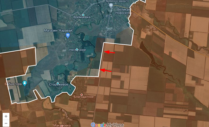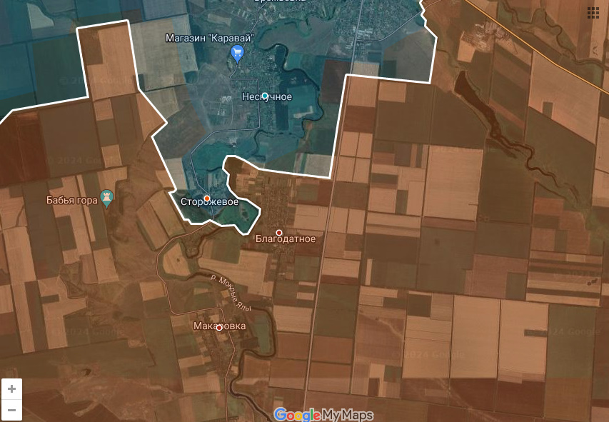 Цитата: Администратор от 23.12.2024, 17:58С Макаровкой (южнее Великоновоселовки) все вышло немного предсказуемо. "Клещи", а затем окружение примерно так и заканчиваются. Как минимум вчера она уже была занята Днр/Рф, а на данный момент на 3/4 окружено Сторожевое. Днр/Рф обошли поселок с северо-востока. Шансов удержать его у Всу практически нет.
