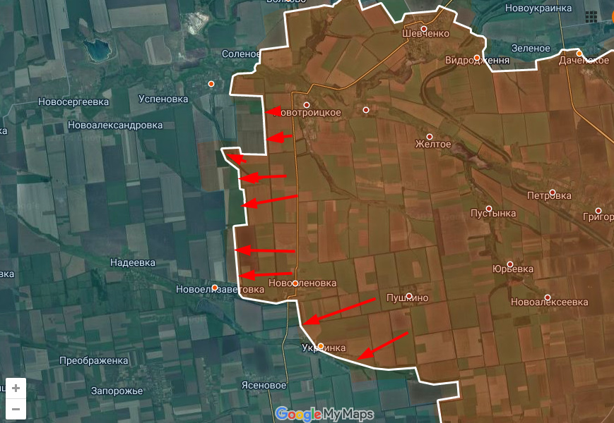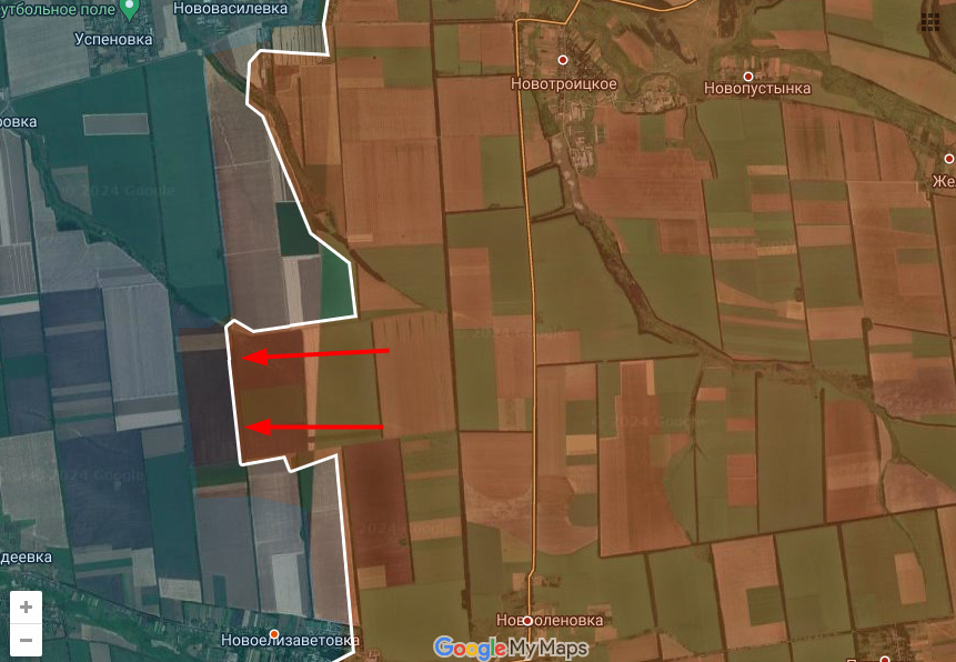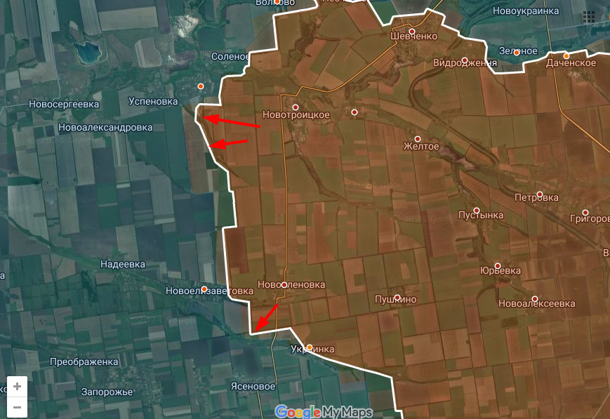 На западном участке очередной прорыв между Нововасильевкой и Новоелизаветовкой. Примечательно, что в случае развития успеха Днр/Рф входят в "коридор" между двумя цепочками населенных пунктов и двигаясь по полям, могут дойти до Днепр. обл и на неск км зайти в неё, Всу просто негде, ввиду отсутствия поселков, устраивать себе опорные пункты "по быстрому", а для возведения фортификаций в полях времени уже нет.