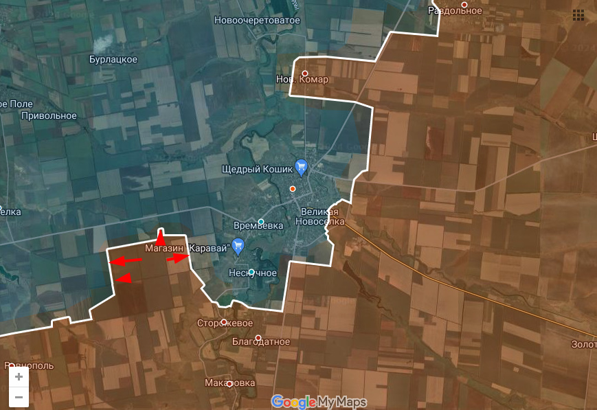 Цитата: Администратор от 23.12.2024, 17:58С Макаровкой (южнее Великоновоселовки) все вышло немного предсказуемо. "Клещи", а затем окружение примерно так и заканчиваются. Как минимум вчера она уже была занята Днр/Рф, а на данный момент на 3/4 окружено Сторожевое. Днр/Рф обошли поселок с северо-востока. Шансов удержать его у Всу практически нет.