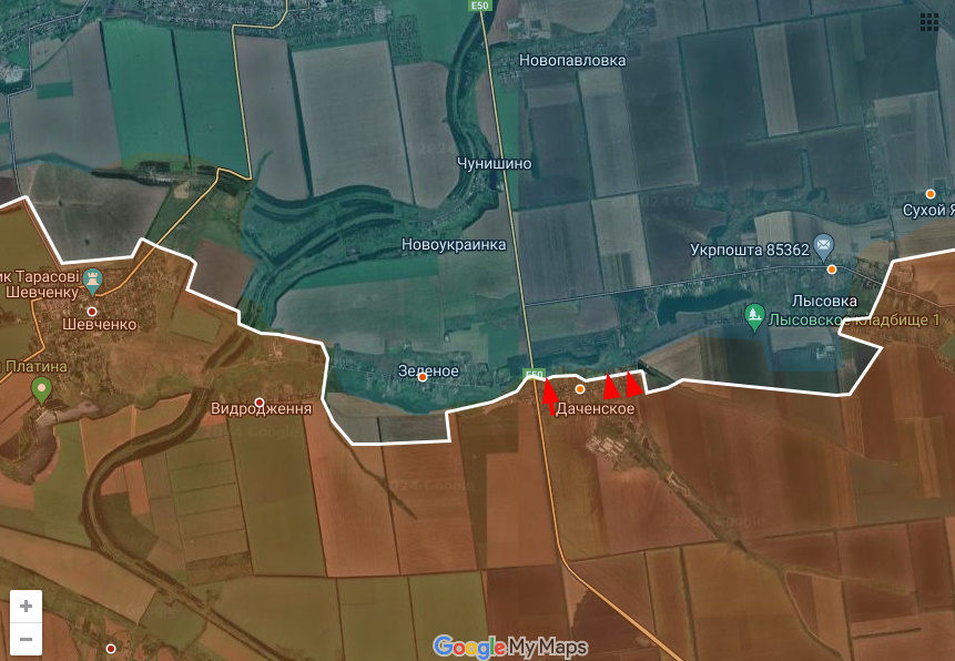 На южной части участка Днр/Рф продавили оборону Всу в Даченском и заняли почти весь поселок. Кроме того, укристочники пишут о прорыве вдоль ЖД к Чунишино, но независимые наблюдатели пока не подтверждают этого.