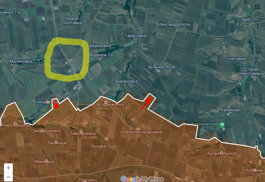 Продолжается движ в районе Воздвиженки. Днр/Рф имеет незначительное продвижение на некоторых участках. Очевидно, тактическая цель - перерезание трассы Красноармейск - Константиновка, оперативная - формирование восточной клешни охвата Красноармейска и она же будет западной для охвата Константиновки.