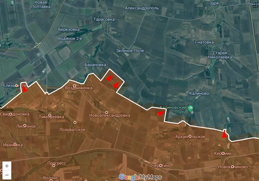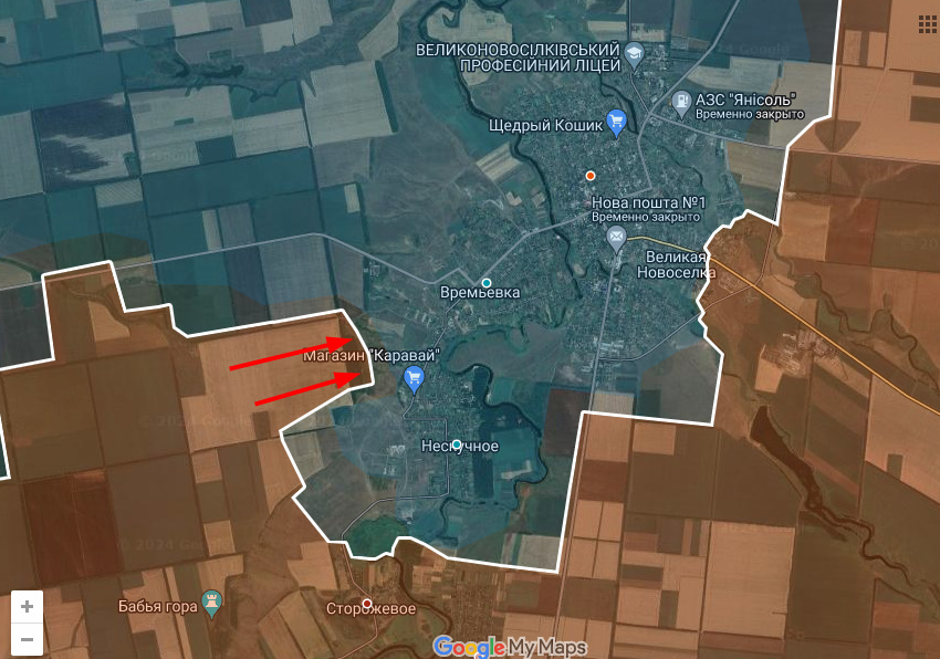 Цитата: Администратор от 06.01.2025, 23:51На великоновоселковском участке Днр/Рф с западного выступа продвинулись вразрез поселкам Времьевка и Нескучное, в результате чего последнее на 3/4 окружено.