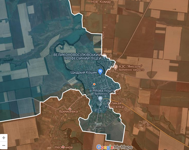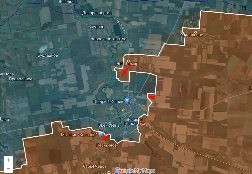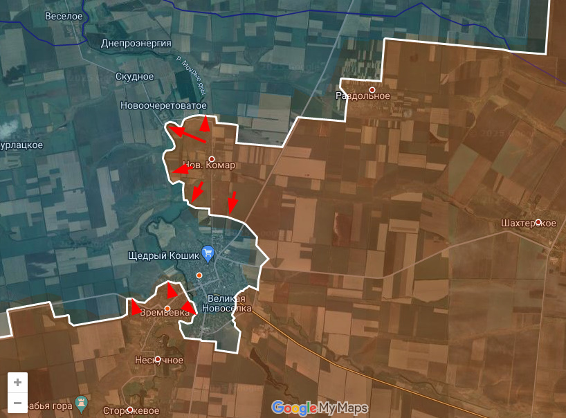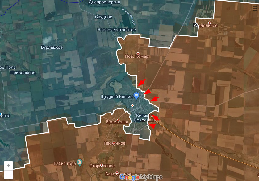 После Времьевки начались атаки самой Великоновоселовки. Пока подтверждается заход Днр/Рф на северо-восточную и юго-восточную окраины райцентра.