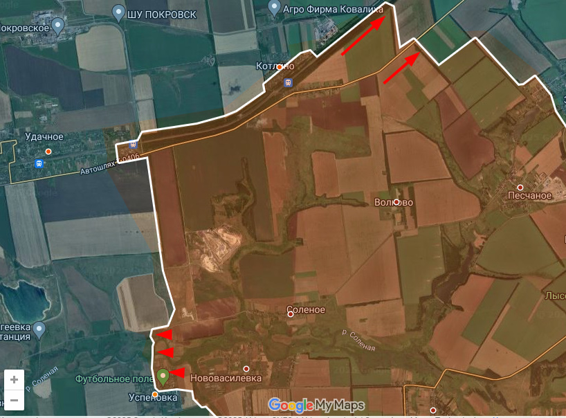 Северо-западнее Днр/Рф продвинулись на запад севернее Успеновки, а также захватили северо-восточную часть населенного пункта. Кроме того, они продвинулись от Котлино в направлении Красноармейска вдоль ЖД и автодороги.