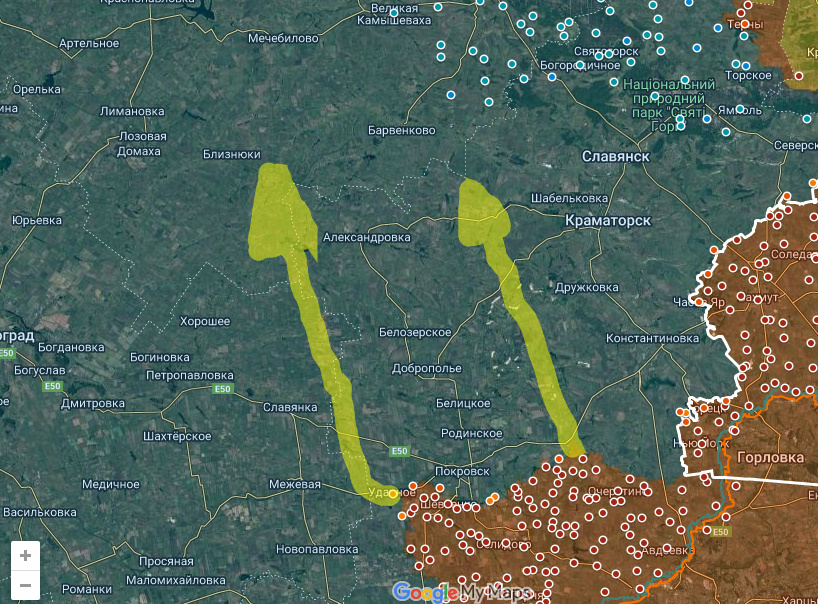 В теории, для Днр/Рф напрашивается удар из района западнее Красноармейска на северо-северо-запад, отсекающий северную часть Донбасса от Украины. В идеале, со встречным ударом с севера. Позже, по мере ослабления укрчастей в окружении, еще один рассекающий удар из района Воздвиженки на север, отделяющий красноармейскую группировку от константиновско-краматорской.