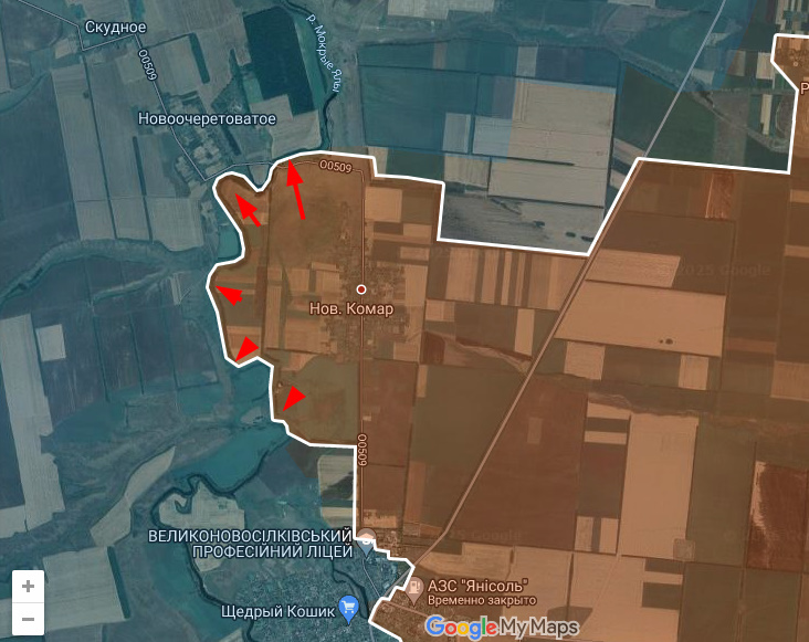 Похоже складывается ситуация и у Великой Новоселовки. Днр/Рф продвинулись от Нового Комара на юго-запад, на 3/4 сформировав кольцо окружения, кроме того, поджимают укроборону по окраинам. Перспектив у сидения в почти окружении, без наличия ресурсов на деблокирующие удары, никаких.