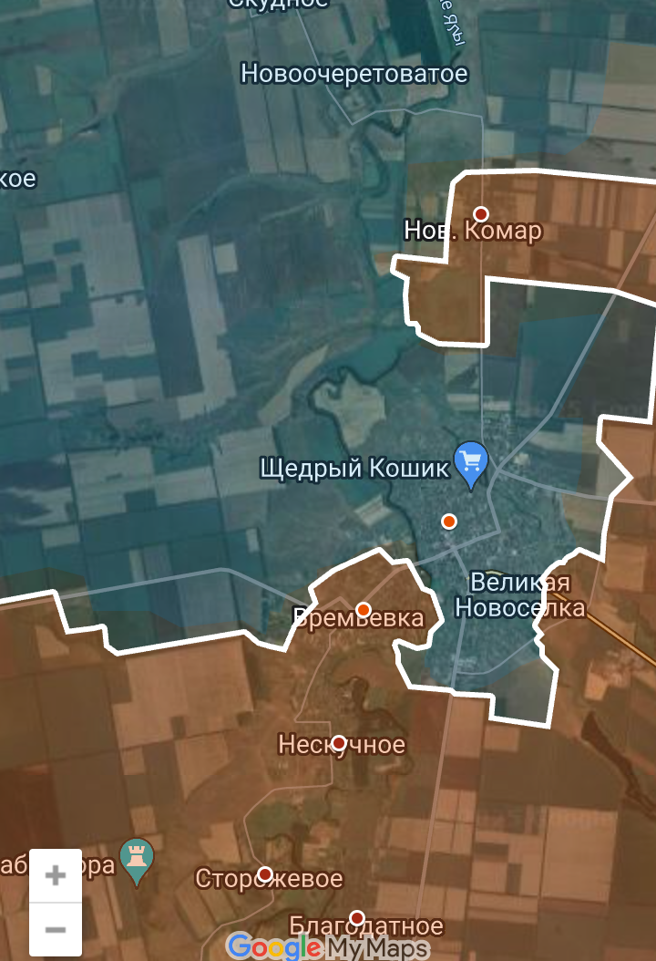 Великоновоселовка зажата, по факту с ней все, но подтверждений полного контроля её Днр/Рф не было.