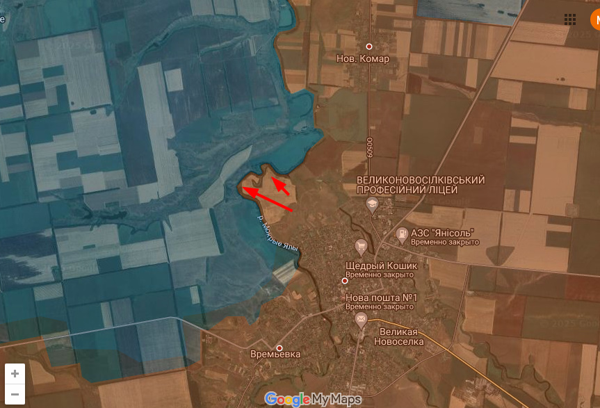 Северо-западнее Великоновоселки Днр/Рф вытеснили Всу с последнего плацдарма на восточном берегу р Мокрые Ялы в этом районе.