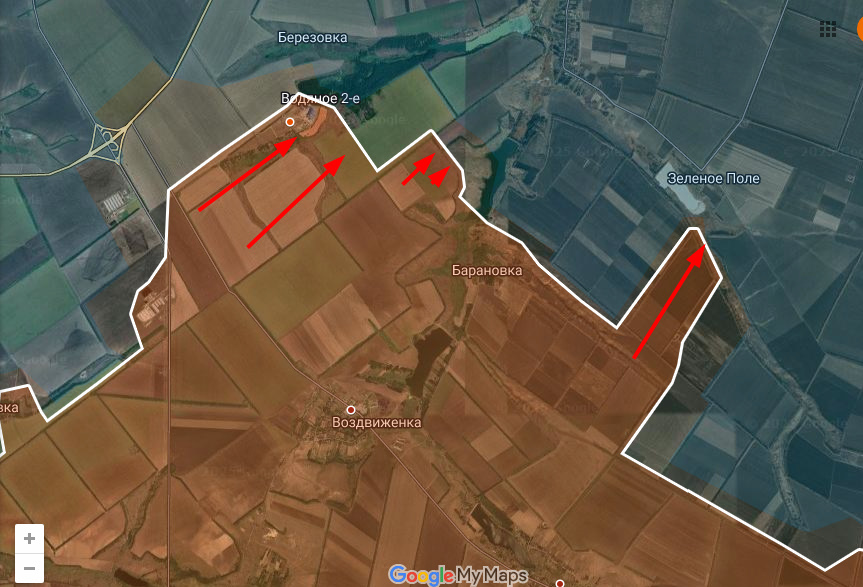 Активизировался и участок Воздвиженки. После выхода на дорогу Днр/Рф Всу довольно быстро смогли отбить тот участок, однако подкопив сил, Днр/Рф продвижение возобновили. Ранее они вышли к окраинам Зеленого Поля, а недавно заняли Водяное-2.